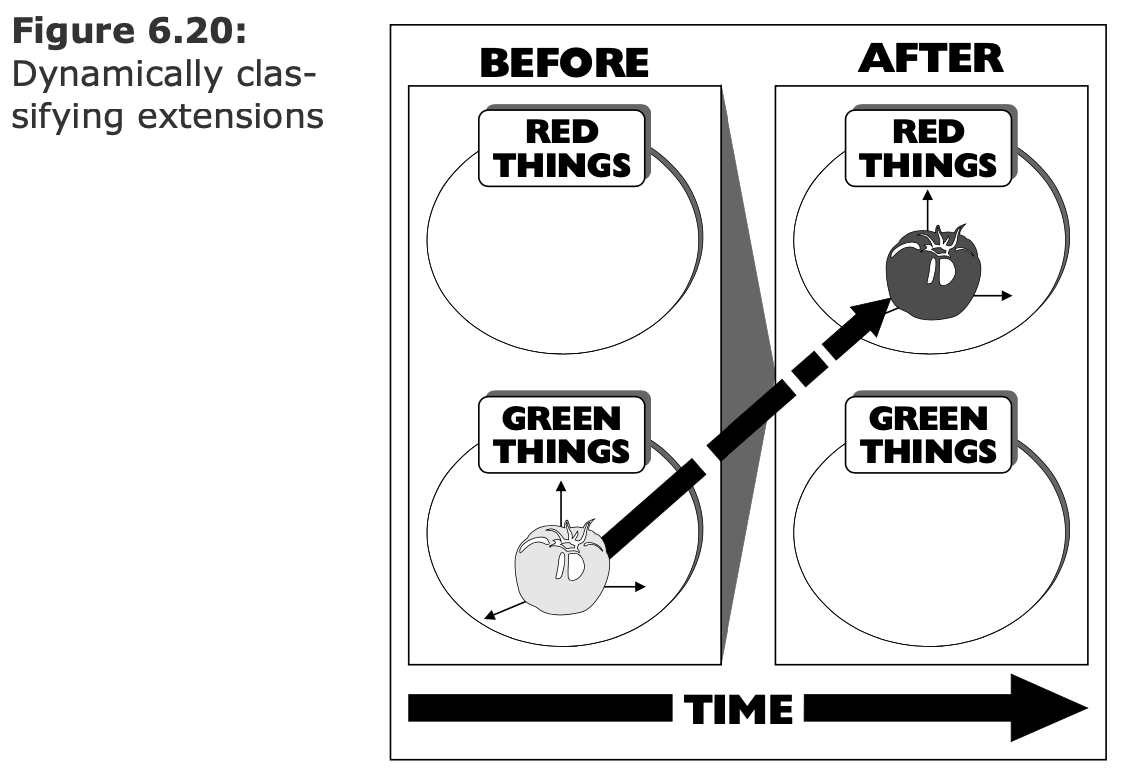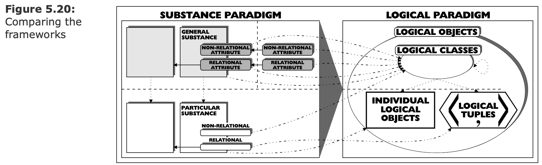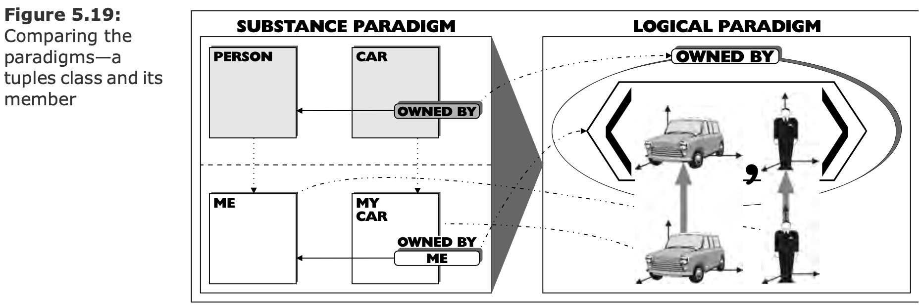 (Logical paradigm, extensionalism)    (*БВК*) - Логический класс (Class) - Логическая пара (Tuple) - Конкретный объект (Individual) ---- ### Проблема необднозначного сопоставления объекта и символа(-ов)  1. Один объект и много символов — норма. 1. Один объект и много интерпретаций — норма. 1. Интерпретации объекта могут не знать друг о друге. 1. Что позволяет идентифицировать объект? ---- ### От субстанции к расширениям (Extension) 1. Отказываемся от понятия "Субстанция" 1. Идентичность — не свойство объекта. 1. Идентичность — навык наблюдателя. 1. Cвойство объекта — результат взаимодействия.  - Как различить одинаковые машины, если не по координатам? - Разве координата имеет отношение к субстанции? - Принцип строгого соответствия: если объекты неразличимы — значит это один объект. ---- #### Атрибут как расширение  ---- #### Субстанция как расширение  ---- #### Множественная классификация  ---- #### Устранение противоречий  - Снятие противоречия: сущность или атрибут. - Гранулярность рассмотрения управляется пользователем, а не разработчиком модели. --- ### Отношение это кортеж (tuple) или пара