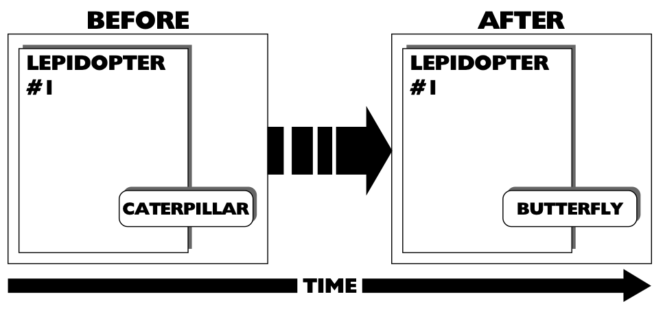 в пространстве-времени  ---- ### Эксперимент с машиной во времени  Расширения (классы) объекта определены с привязкой ко времени. ---- ### Четырёхмерная бабочка