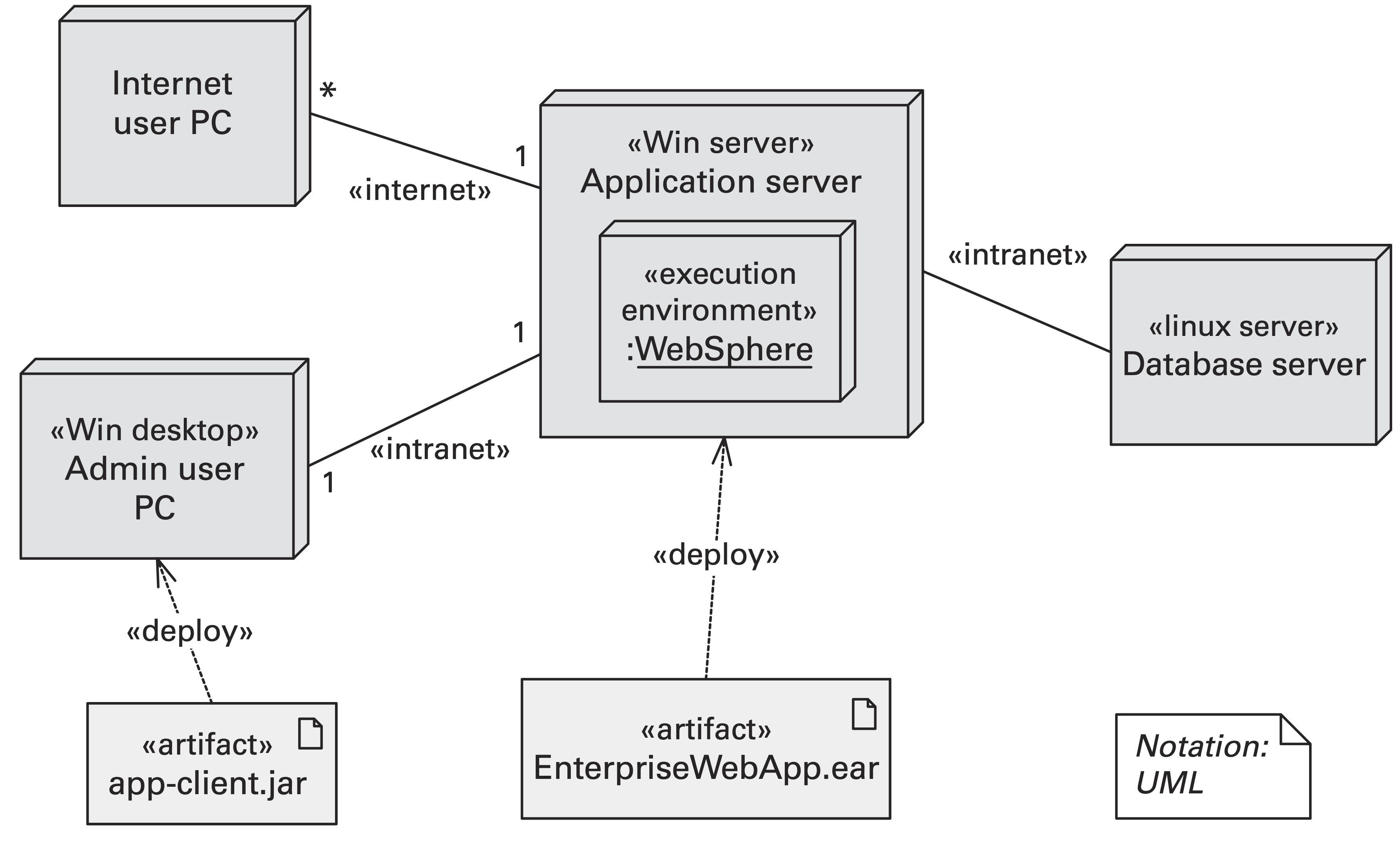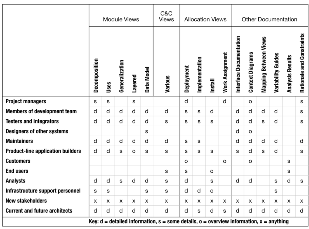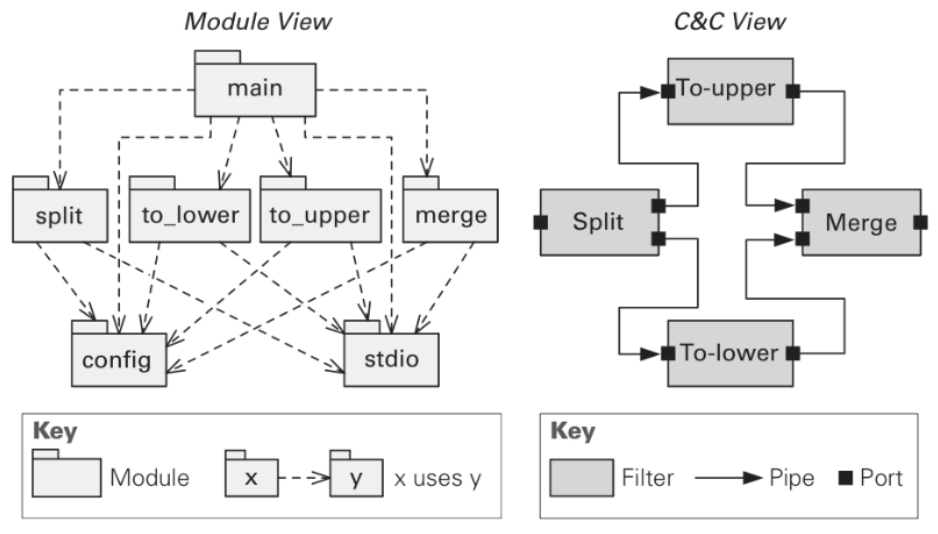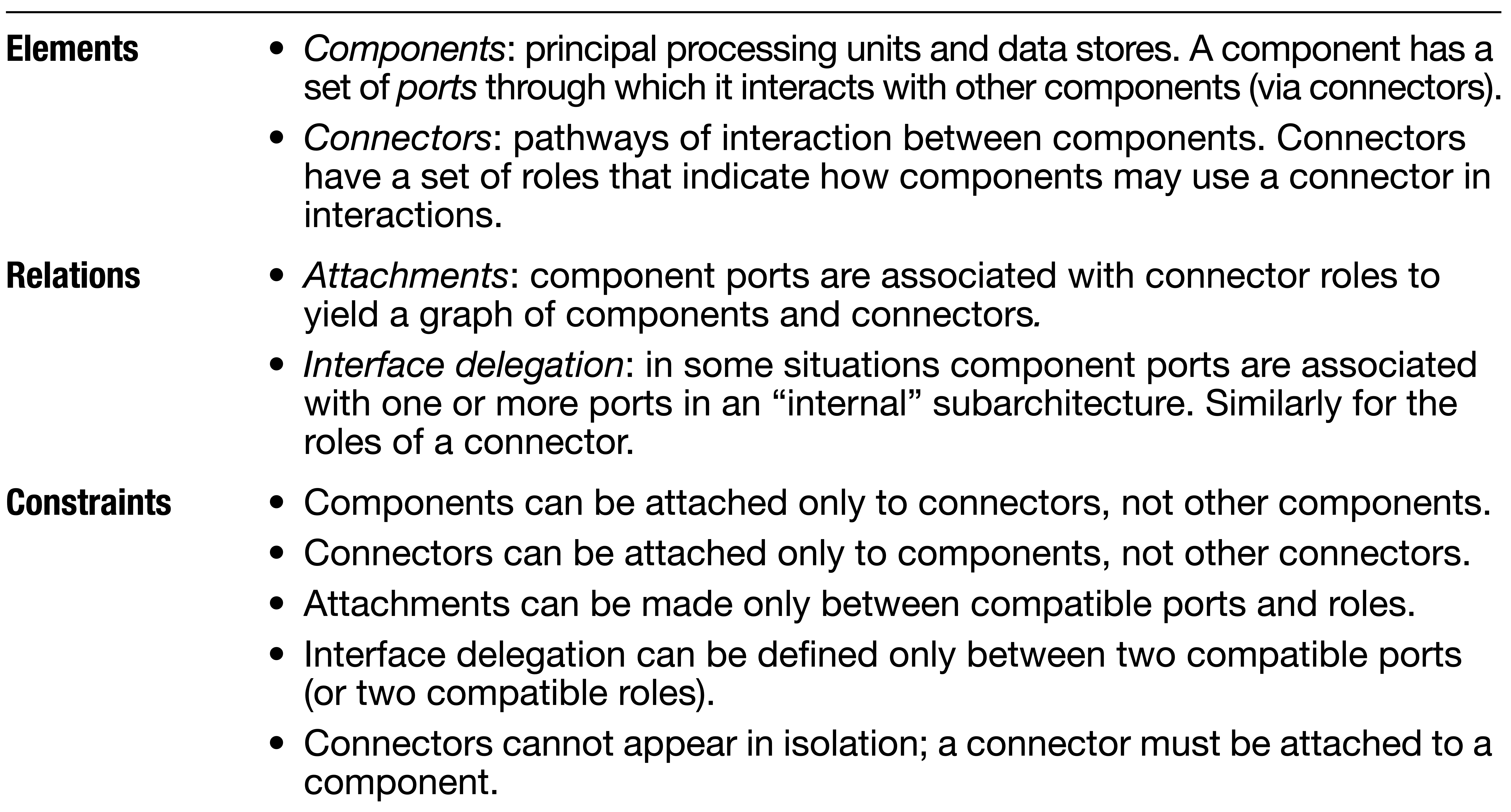 1. **Informal notations**. Views are depicted (often graphically) using general-purpose diagramming. The semantics are in natural language. 2. **Semiformal notations**. Views are expressed in a standardized notation that prescribes graphical elements and rules of construction, but does not provide a complete semantic treatment (e.g., UML). 3. **Formal notations**. Views are described in a notation that has a precise (usually mathematically based) semantics (Architecture description language — ADL).