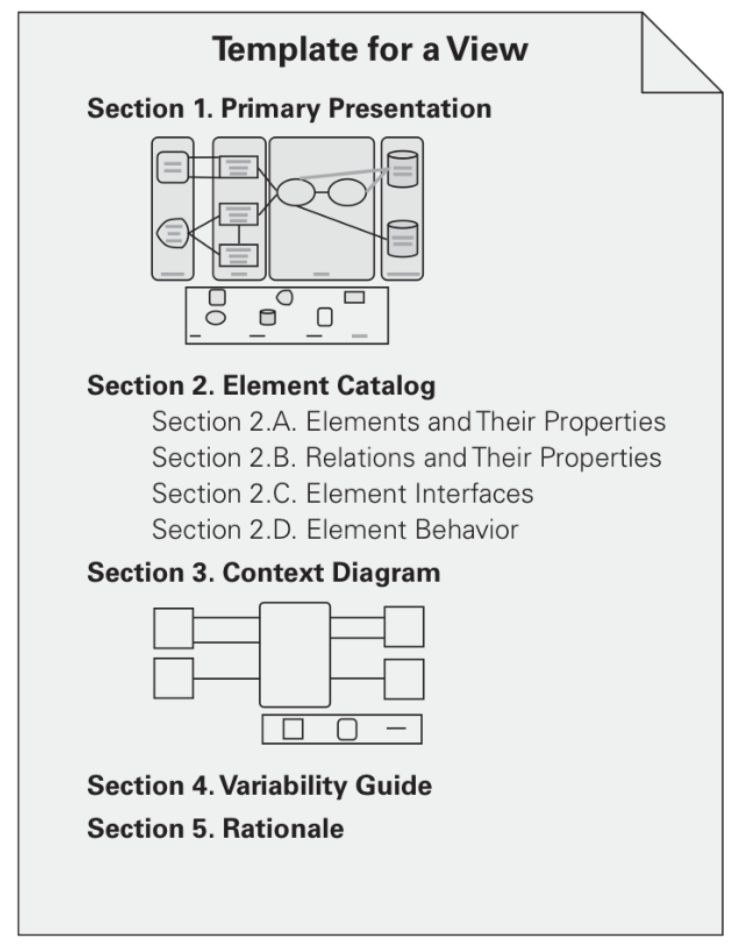 ---- ### Наименование представления What you describe in the view. ### Основное представление The **primary presentation** shows the elements and relations of the view. The primary presentation should contain the information you wish to convey about the system. ---- ### Каталог элементов (Element Catalog) The **element catalog** details at least those elements depicted in the primary presentation. E.g., if a diagram shows elements A, B, and C, then the element catalog needs to explain what A, B, and C are and their purposes or the roles they play. Подразделы: - Элементы и их свойства - Отношения и их свойства - Интерфейсы элементов - Поведение элементов ---- #### Элементы и их свойства (Elements and properties) This section names each element in the view and lists their properties. Properties depend on the architectural style, e.g., a decomposition style might have a "responsibility" property — the module's role in the system. #### Отношения и их свойства (Relations and properties) Mostly, these relations are shown in the primary presentation. If not, or if the description requires additional details — this is the place to record them. #### Интерфейсы элементов (Element interfaces) This section documents element interfaces. #### Поведение элементов (Element behavior) Some elements have complex interactions with the environment. For purposes of understanding or analysis, they need to be documented. ---- ### Диаграмма контекста (Context Diagram) Shows how the system or portion of the system depicted in this view relates to its environment. ### Инструкции по вариативности