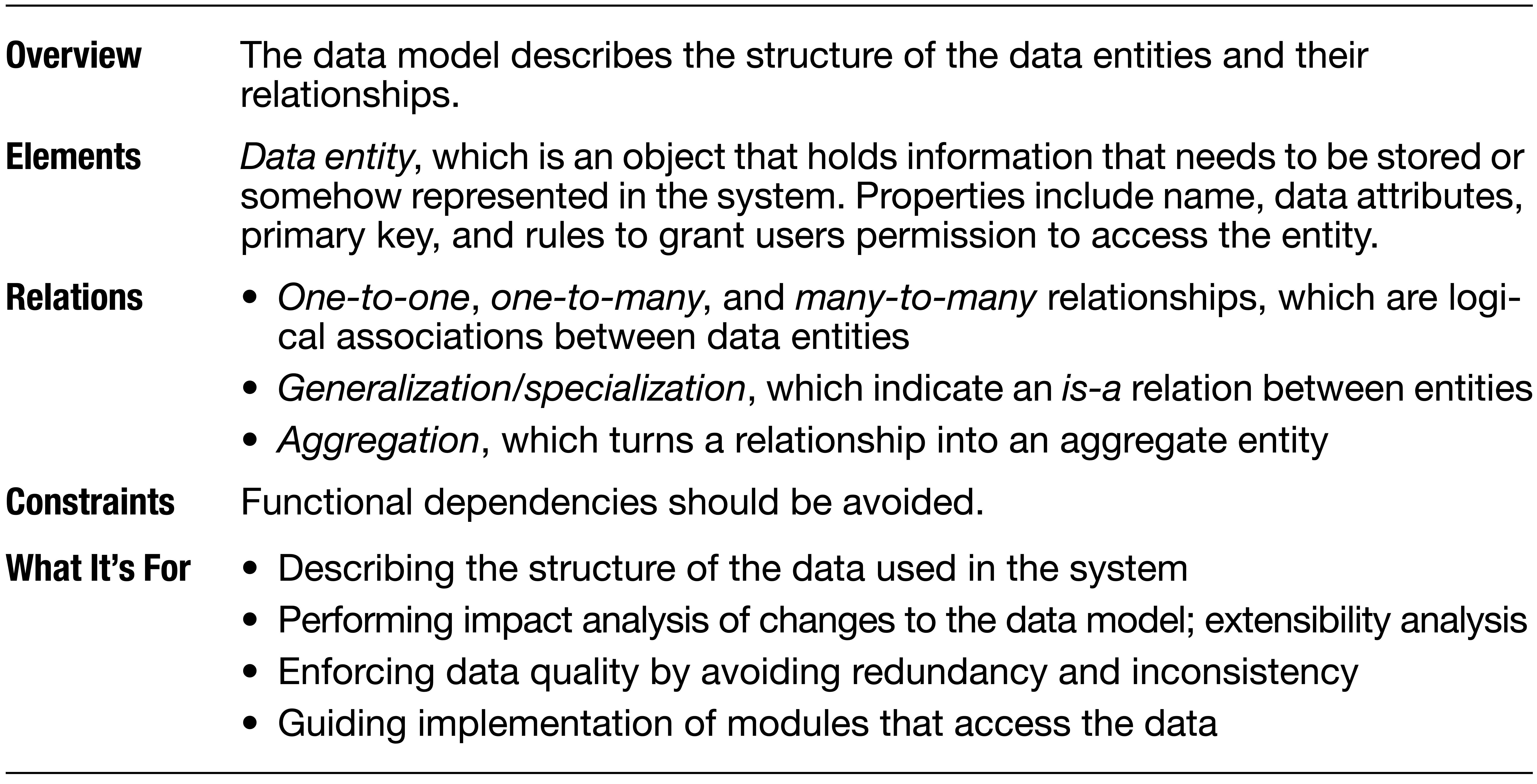 - Представление предметной области. - Структура и корректность представления данных в системе. - Механизмы доступа и обработки данных.