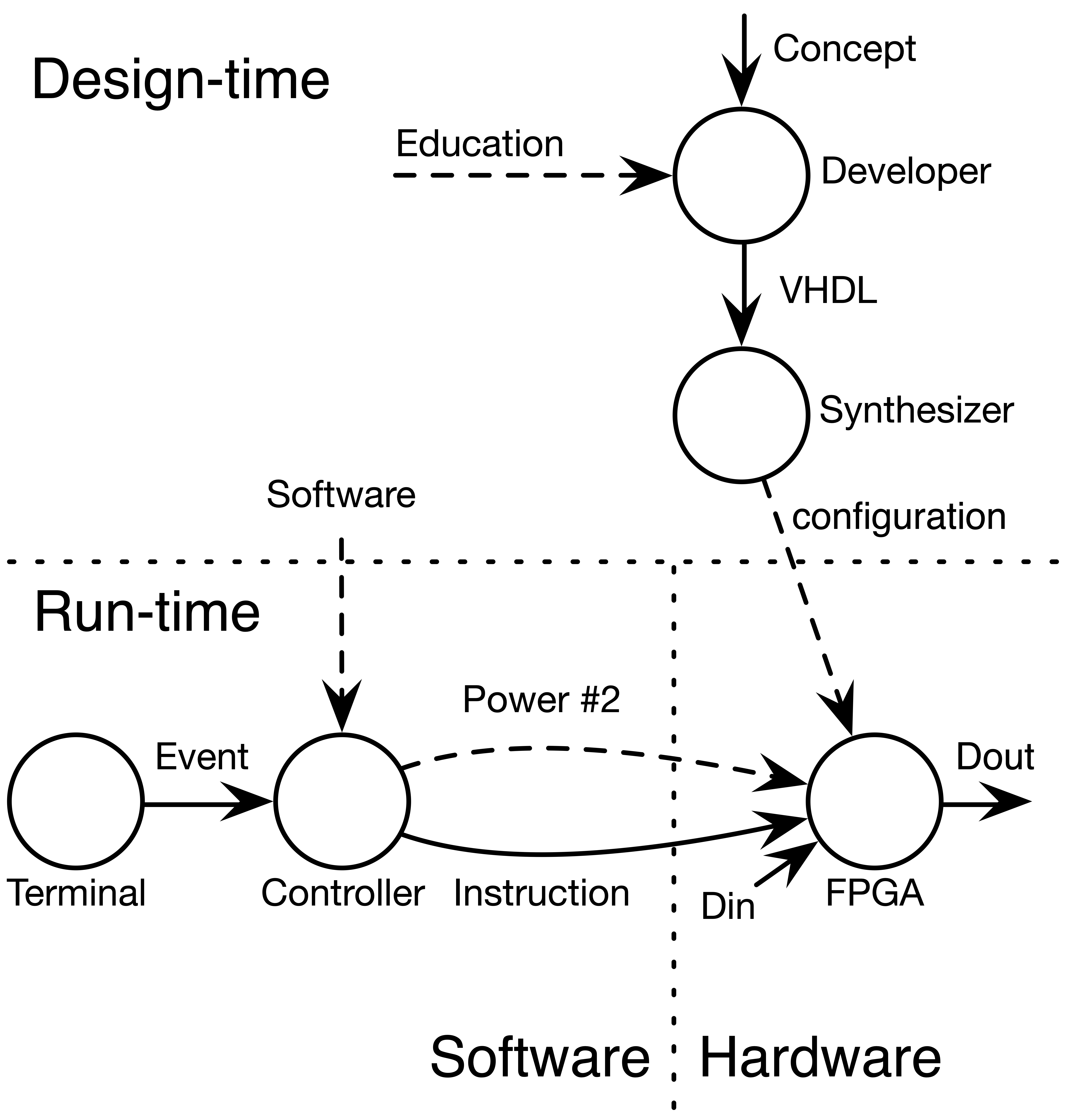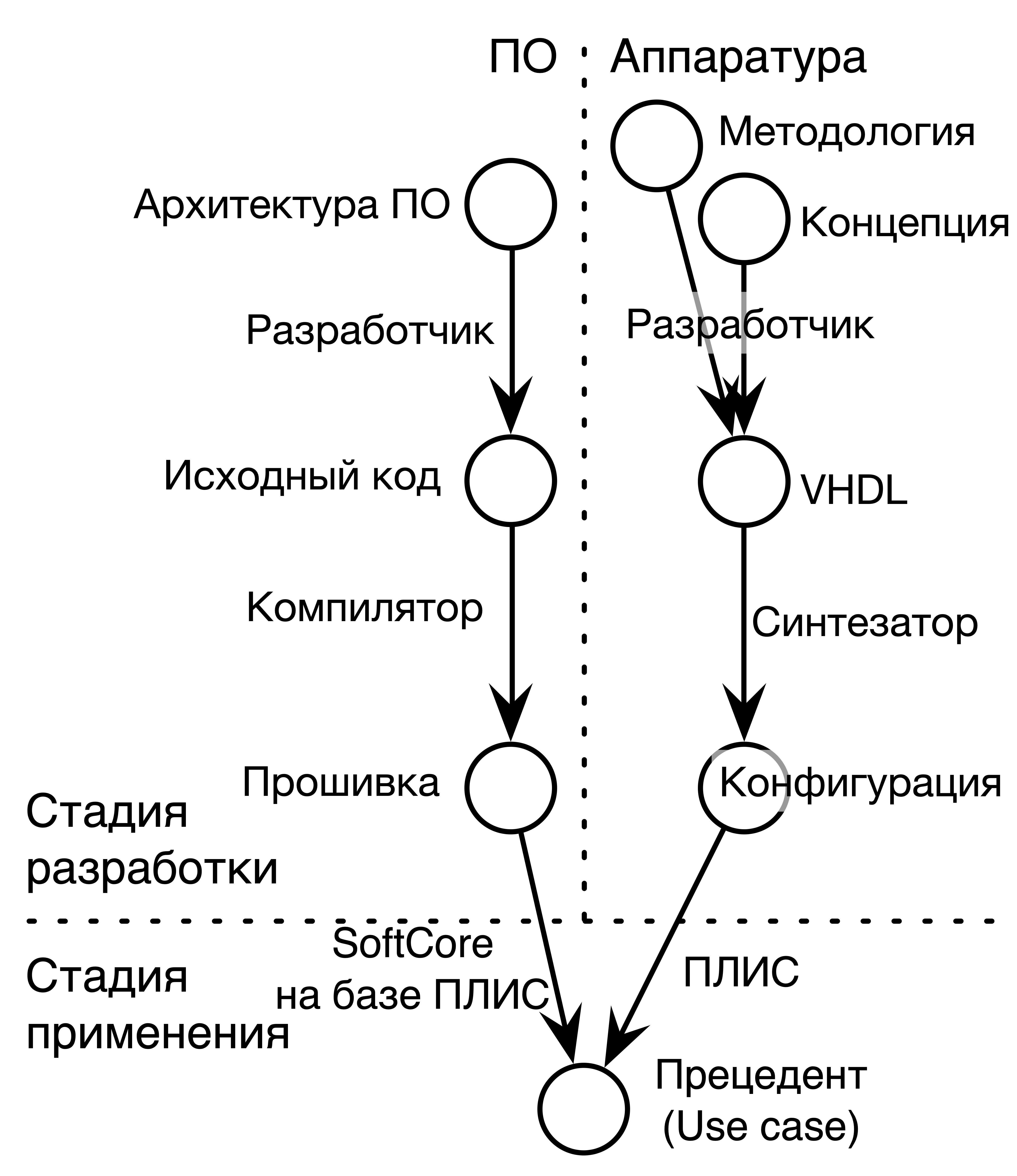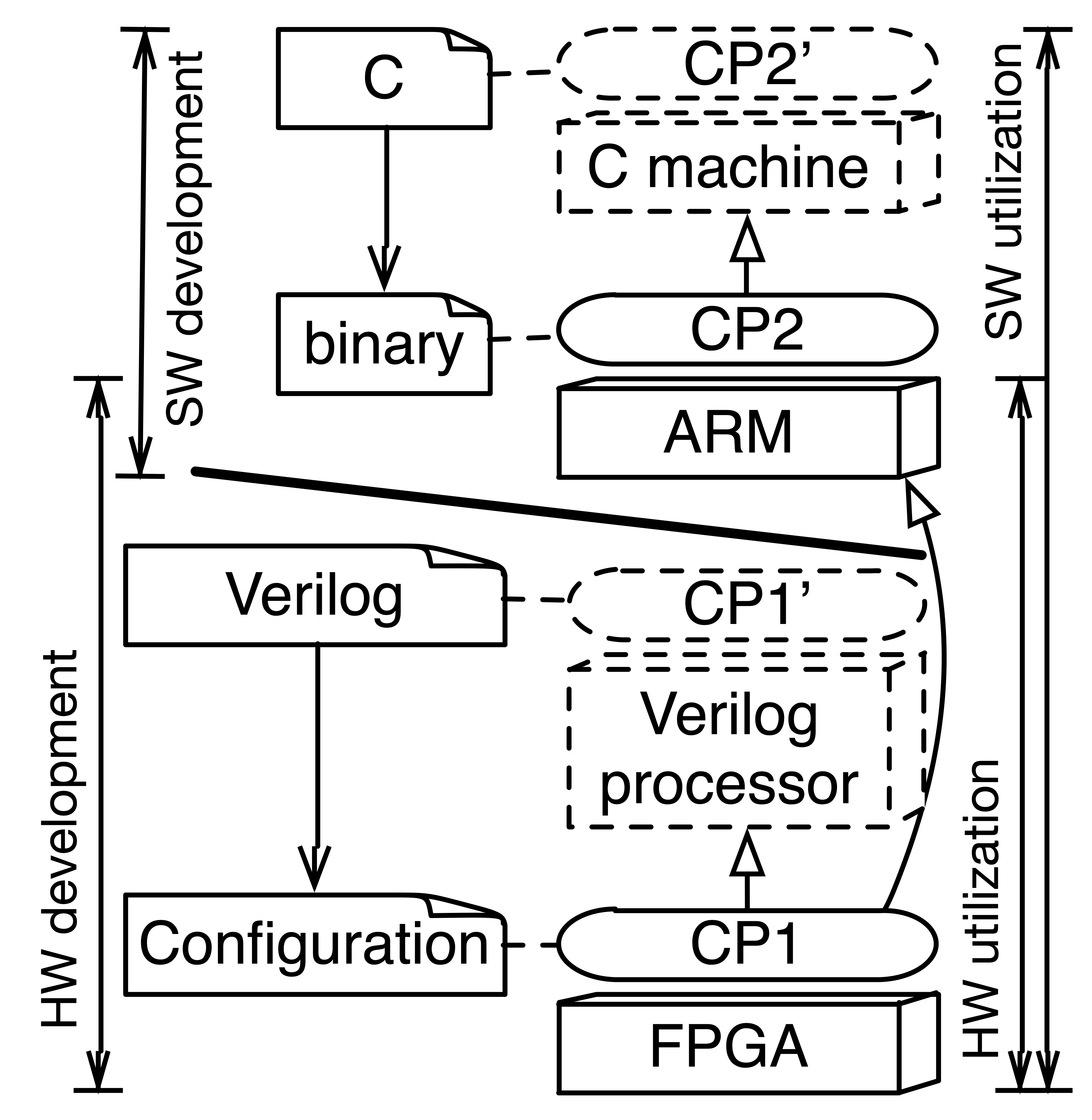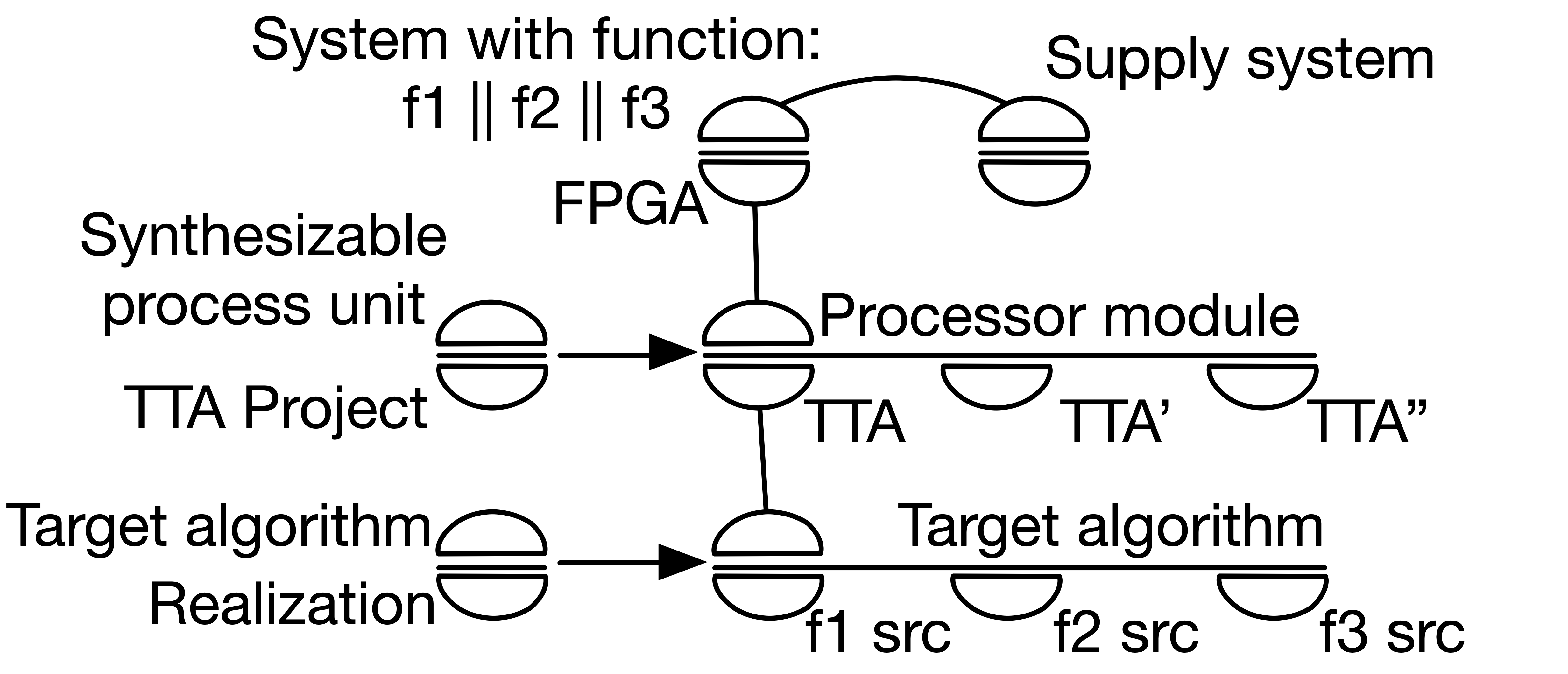 - Represent the structure of computational process actualisation. - One of axis of design space. - Oriented acyclic graph, where vertex — translator, arcs — any transfers between translator. - Unified computation process representation for - Design-time and run-time phases. - Software and Hardware component.