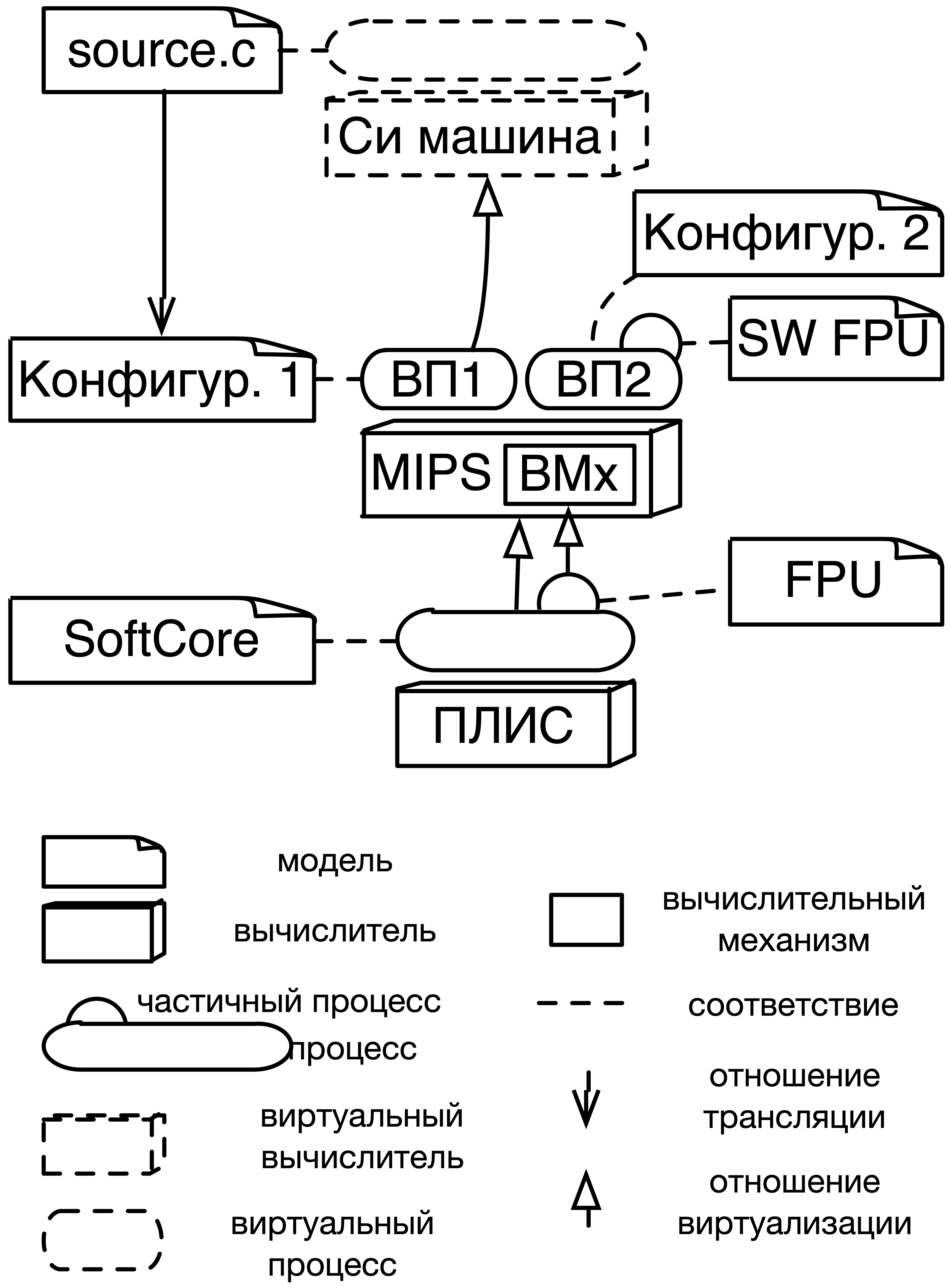 - Вычислительный механизм (ВМх) — часть вычислителя, обеспечивающая компонент ВП. - Отношение виртуализации — абстракция над процессом, фиксирующая вычислитель. - Определяет полное множество атомарных компонент ВП и позволяет описать любой допустимый ВП. - Невыразимость процесса говорит о сбое вычислителя или некорректной виртуализации. - Отношение трансляции — формальное соответствие двух моделей друг другу.