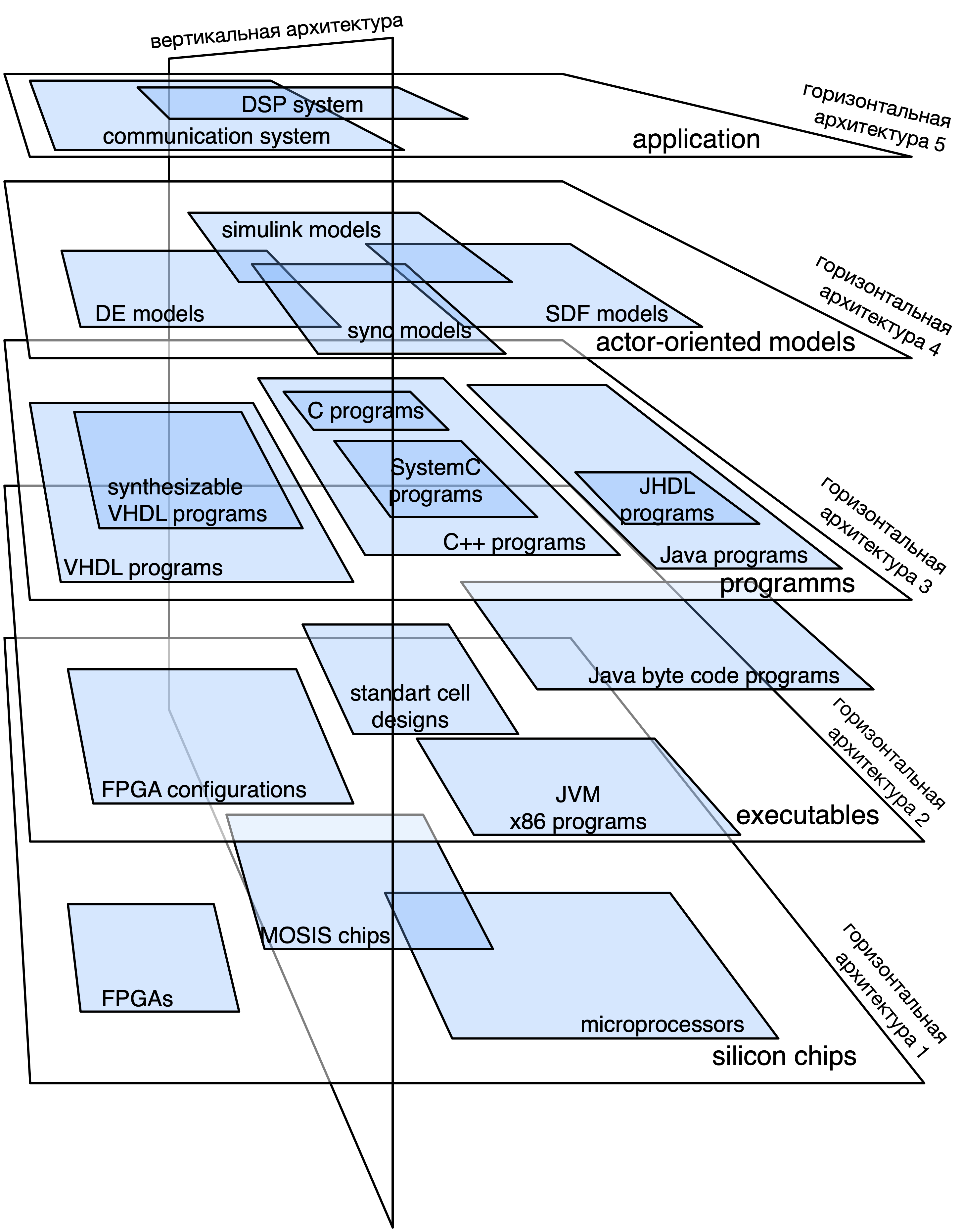 1. Specification of layers and their relationship. 2. In opposite to "horizontal" specification we offer "vertical" architectural specification. 3. Relationship — evaluation or actualisation.